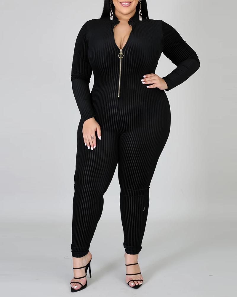 Plus Size Zipper Design Long Sleeve Jumpsuit, Black
