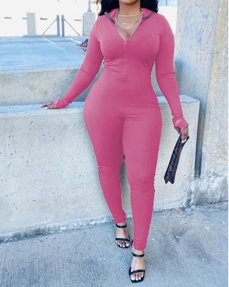 Plus Size Zipper Front Ribbed Jumpsuit, Hot pink