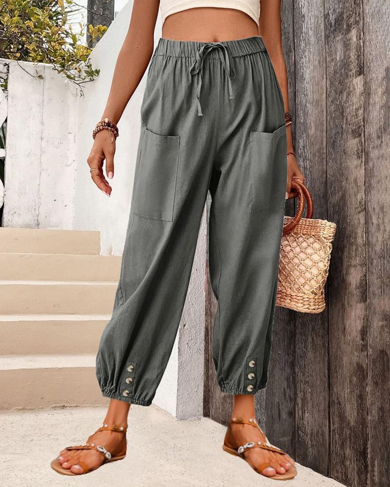 Pocket Button Design Drawstring Casual Pants, Dark grey