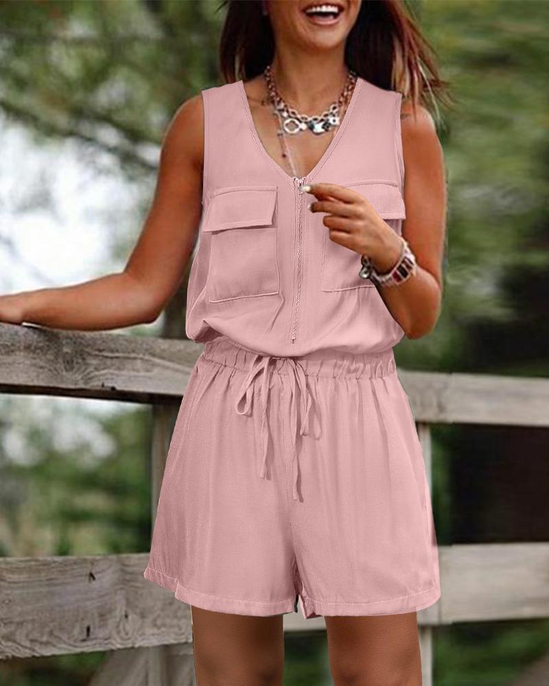 Pocket Decor Drawstring Sleeveless Romper, Pink
