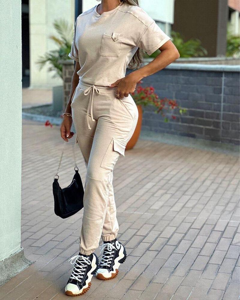 Pocket Design Buttoned Top & Drawstring Cuffed Pants Set, Apricot
