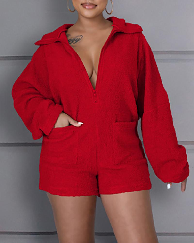 Pocket Design Long Sleeve Hooded Teddy Romper, Red