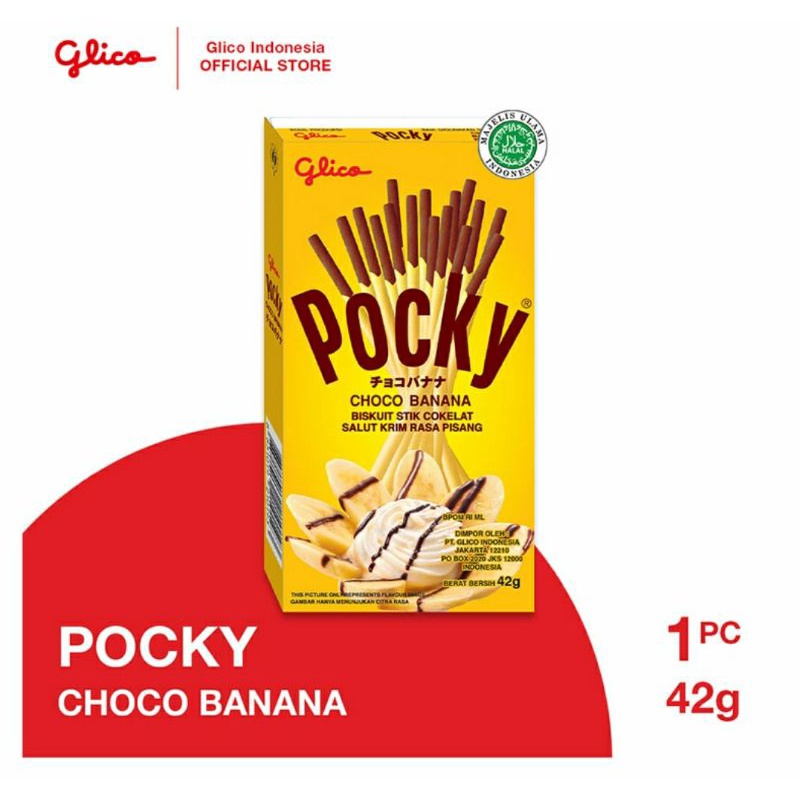 Glico pocky, biskuit stik cokelat renyah dan panjang berlapis krim rasa pisang.