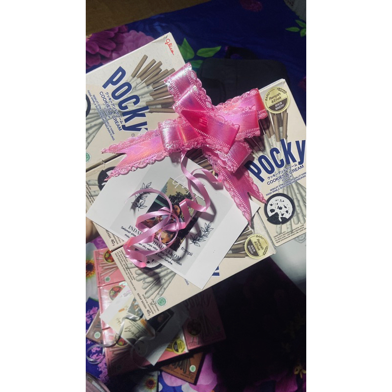 Pocky yang di bentuk dan dihias dengan pita , bisa request sesuai keinginan ya kak.