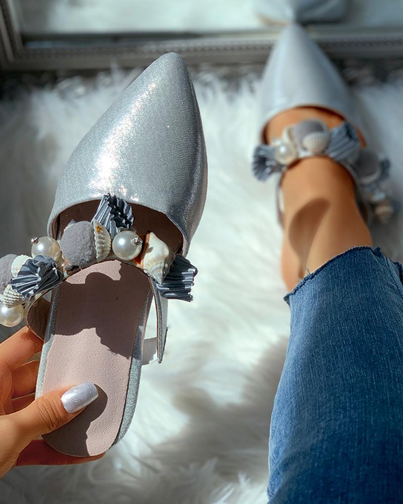 Pointed Toe Beaded Strap Flat Sandals, Silver