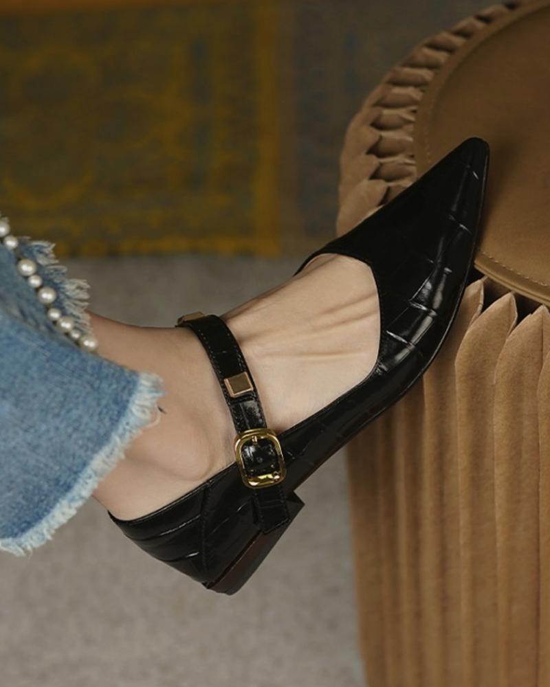 Pointed Toe Buckle Croc Embossed Shoes, Black