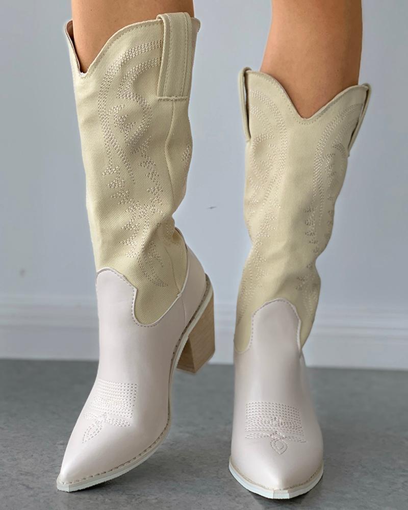 Pointed Toe Embroidery Chunky Heeled Boots, Beige
