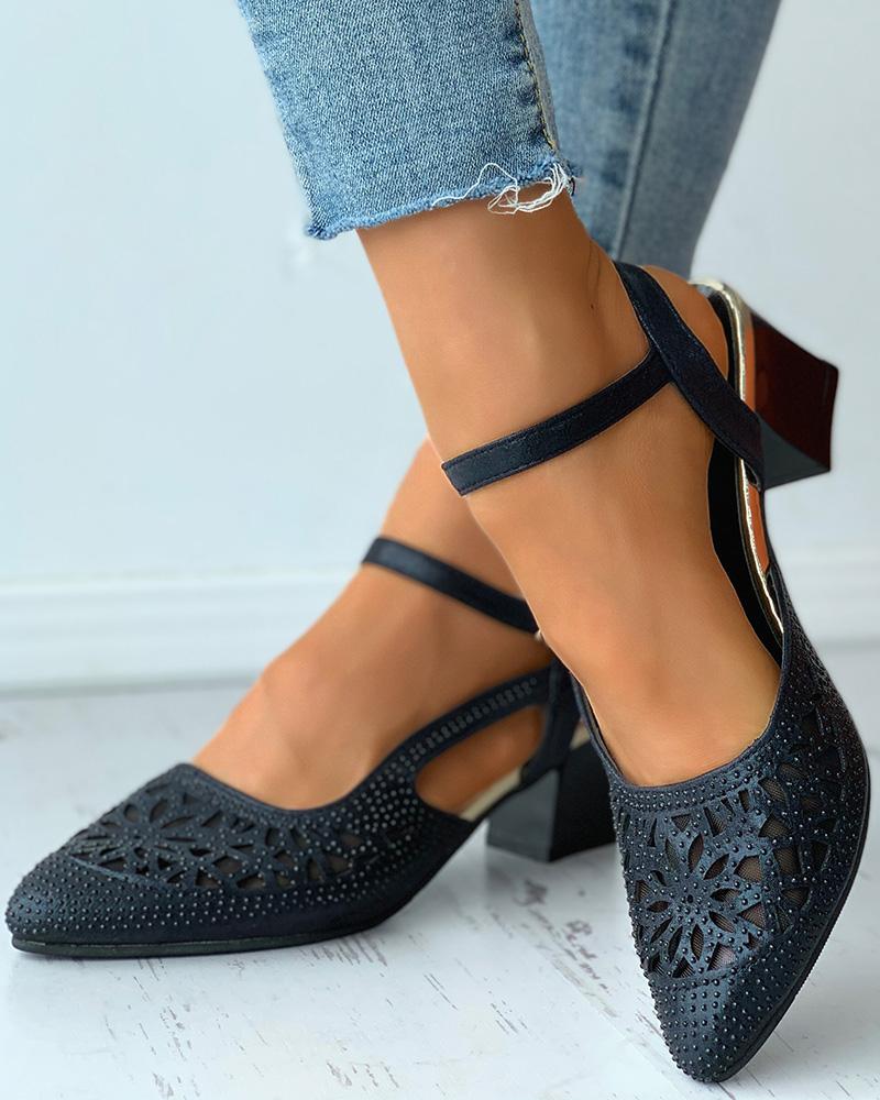 Pointed Toe Rhinestone Cutout Chunky Heels, Black
