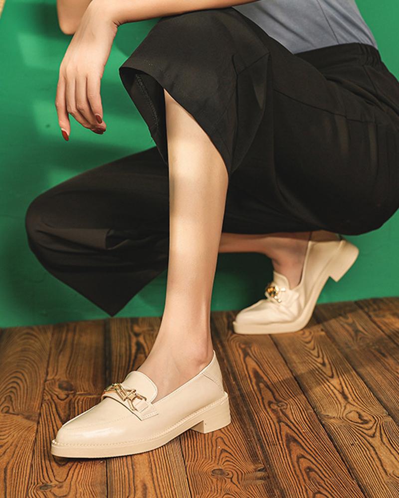 Pointed-toe Solid Color Splicing Chain Loafers, Apricot
