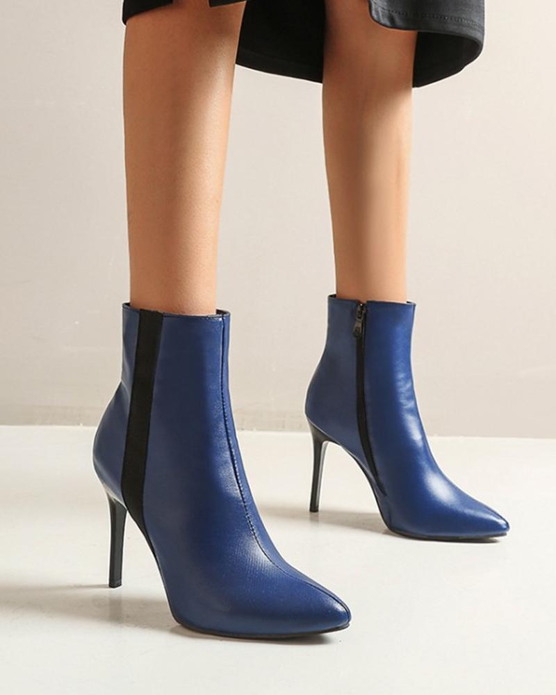 Pointed-toe Solid Color Splicing Zipper Stiletto Heels, Dark blue