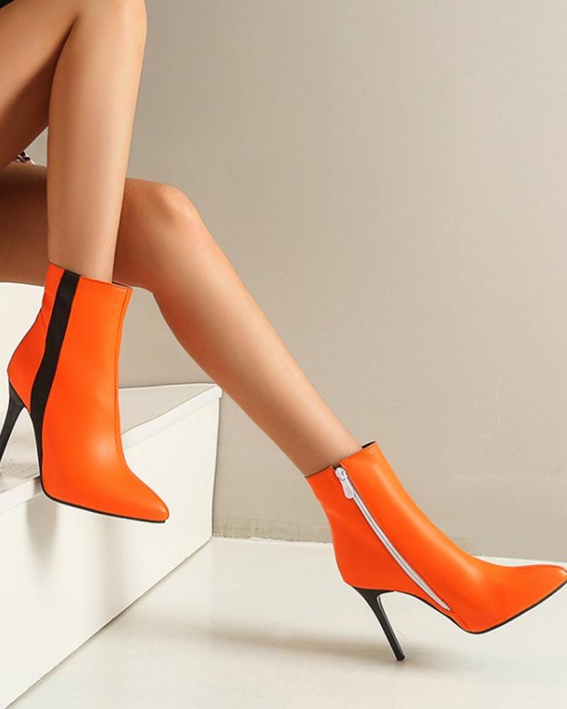 Pointed-toe Solid Color Splicing Zipper Stiletto Heels, Orange