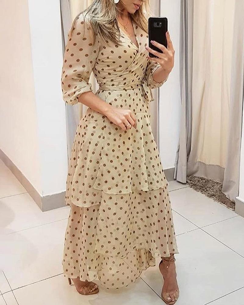 Polkadot Print Layered Ruffles Maxi Dress, Beige