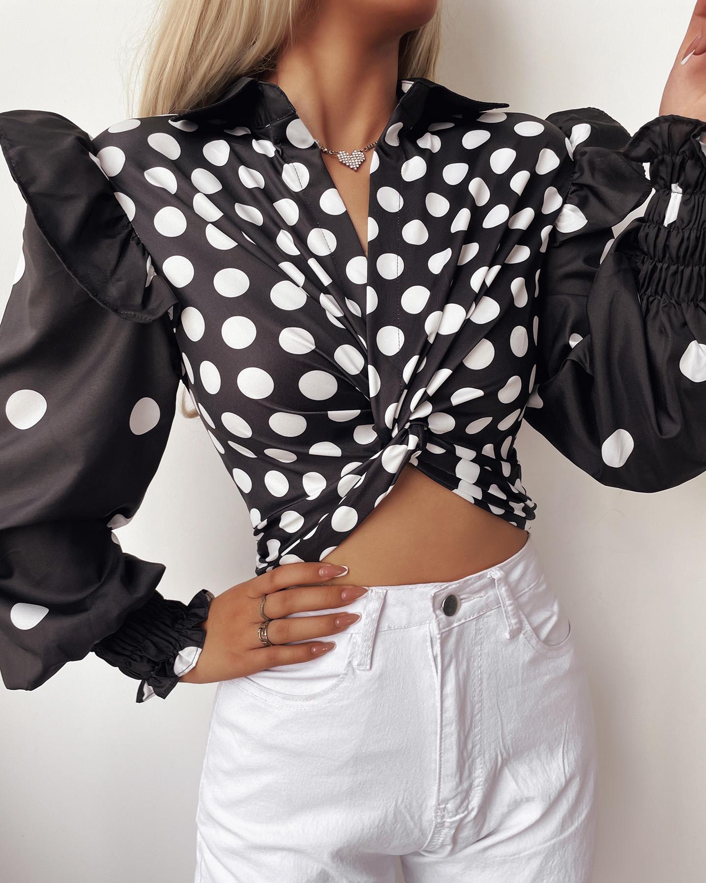 Polkadot Print Ruffle Hem Twisted Shirred Top, Black
