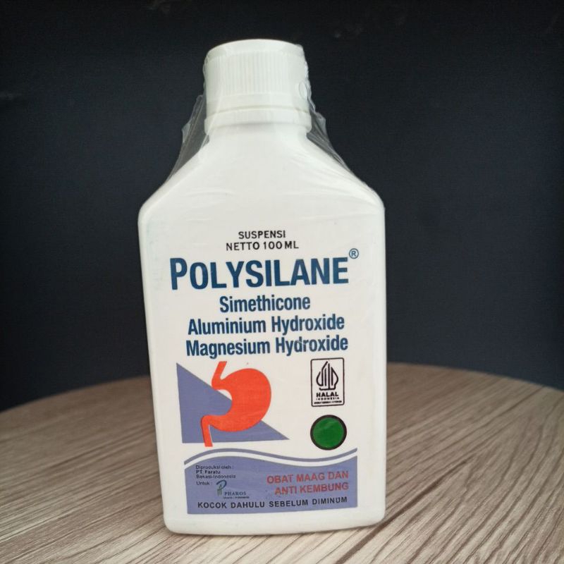 Polysilane sirup 100 mL diproduksi oleh PT. Pharos-Indonesia yang telah terdaftar pada BPOM. Polysilane sirup mengandung Mg(OH)2 200 mg, Al(OH)3 200 mg, dimethicone 80 mg dalam tiap 5 mL. Polysilane dapat digunakan untuk mengurangi gejala yang berhubungan dengan kelebihan asam lambung, gastritis, tukak lambung, tukak usus 12 jari, dengan gejala seperti mual, nyeri ulu hati, nyeri lambung, kembung, dan perasaan penuh pada lambung.