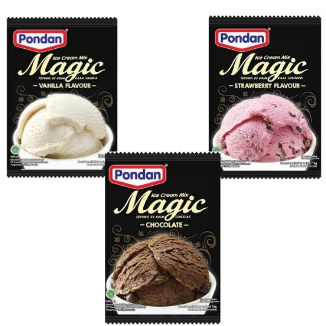 *Pondan magic ice cream merupakan tepung premix untuk pembuatan kue ice cream instan dari pondan,dengan menggunakan tepung ini membuat ice cream sangatlah praktis,mudah,tinggal menambahkan air es dan es batu bisa dibuat kapan saja.cara penyajian sudah tertera dibelakang kemasan produk.