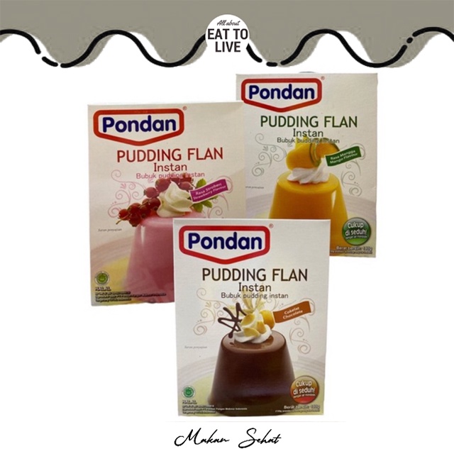 Bubuk pudding instan, cukup di seduh dengan air mendidih . Pudding flan instan menghadirkan sensai pudding dengan tekstur lembut dalam 4 rasa nikmat