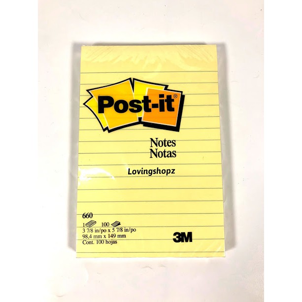 Post It Notes bergaris dengan warna kuning Ukuran 98,4 mm X 149 mm, cocok digunakan untuk ditempel di kertas maupun permukaan vertikal seperti layar komputer, kaca, dinding dan lain sebagainya. Post-it Notes 660 ini akan tetap menempel meskipun ditempel pada permukaan kertas yang melengkung karena perekatnya tidak akan meninggalkan residu. Kertas juga tidak akan melengkung saat ditempelkan sehingga kertas mudah untuk ditulisi.