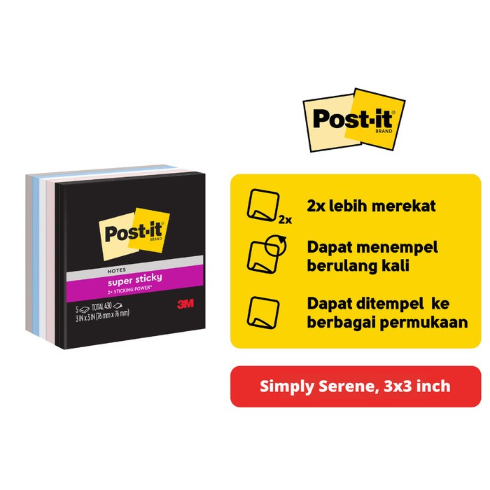 Post-it Super Sticky Notes merupakan Memo Tempel 3x3" berisikan 5 pad, terdiri dari 430 lembar (70 lembar untuk warna Onyk dan masing-masing 90 lembar untuk 4 warna lain dalam kemasan)