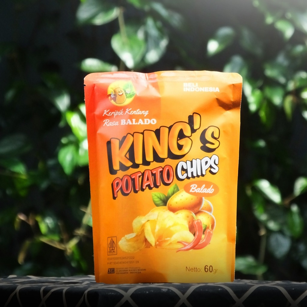 Potato Chips Kings Rasa Balado, camilan pedas gurih yang bikin ketagihan! Cocok untuk pecinta rasa Nusantara yang unik dan lezat.