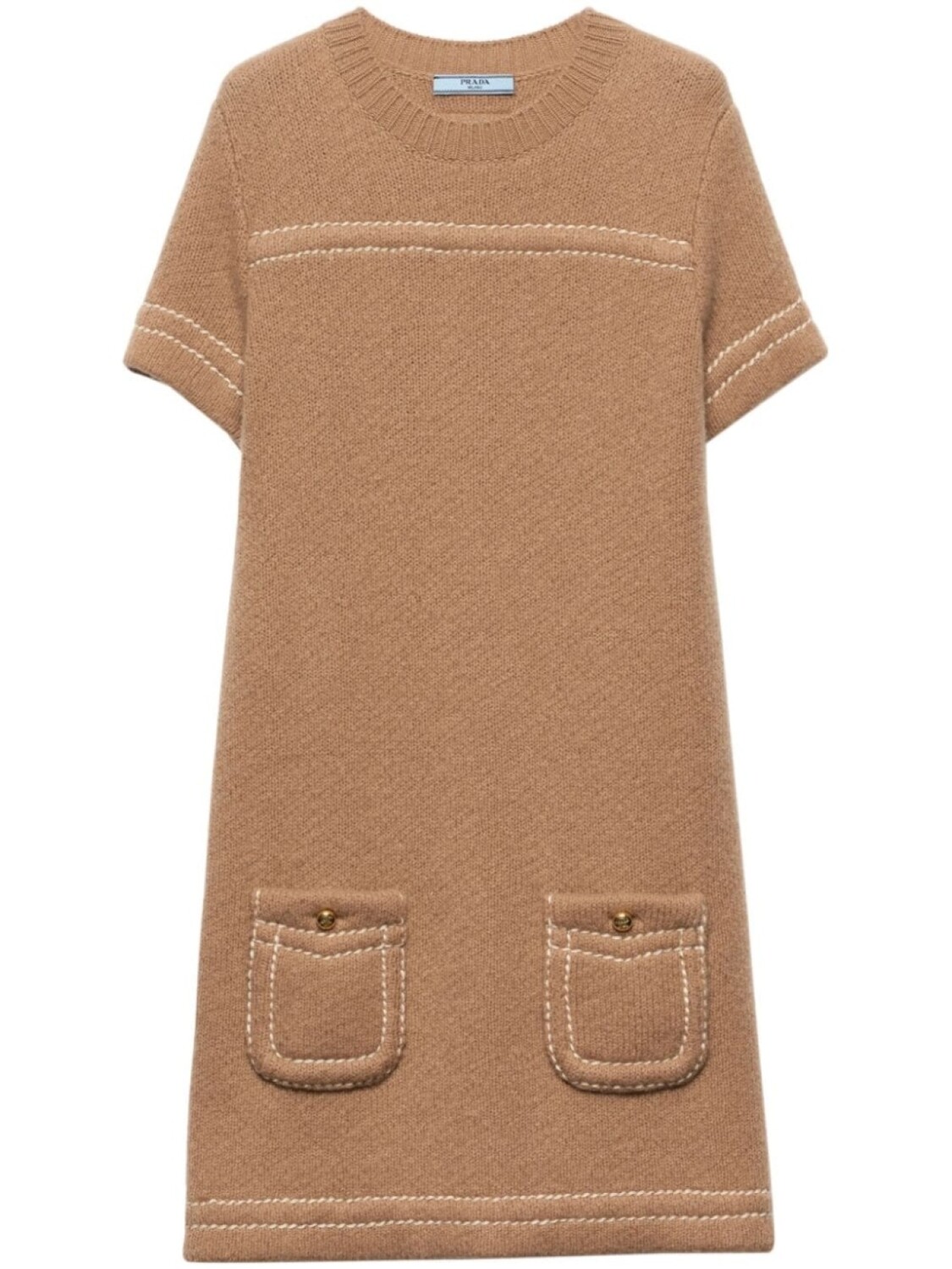 Подробнее о товаре: • бежево-коричневый • кашемир • декоративная строчка • треугольный логотип • круглый вырез • короткие рукава • два накладных кармана спереди • прямой подол
