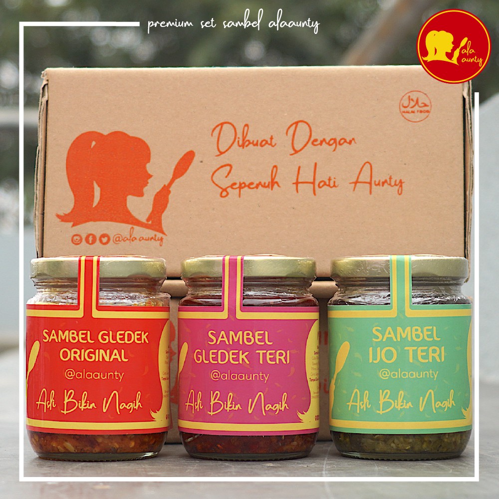 Premium Set Sambel AlaAunty adalah Paket Sambel AlaAunty berisi 3 Jar Sambel. Harga bisa lebih hemat. Tentukan sendiri Premium Set pilihanmu.