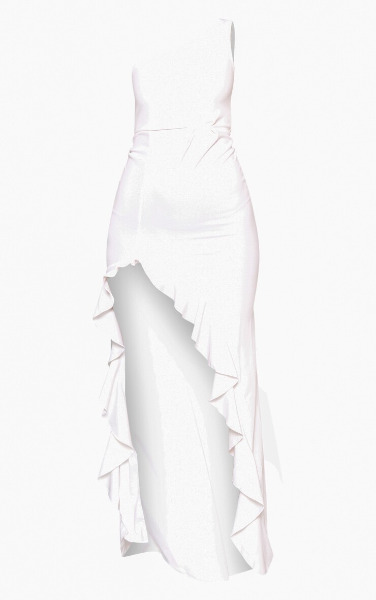 PrettyLittleThing Белое платье макси на одно плечо с рюшами и подолом, Белый, PrettyLittleThing Белое платье макси на одно плечо с рюшами и подолом