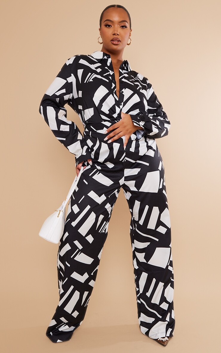 PrettyLittleThing Черные широкие брюки с абстрактным принтом Plus, Черный, PrettyLittleThing Черные широкие брюки с абстрактным принтом Plus