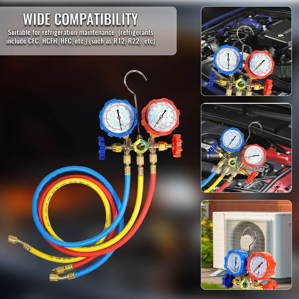 Pro Manifold Gauge Set 3-way Refrigerant Charging Service for R410A R22 R404A R134A with Hoses - Complete AC Diagnostic Tool