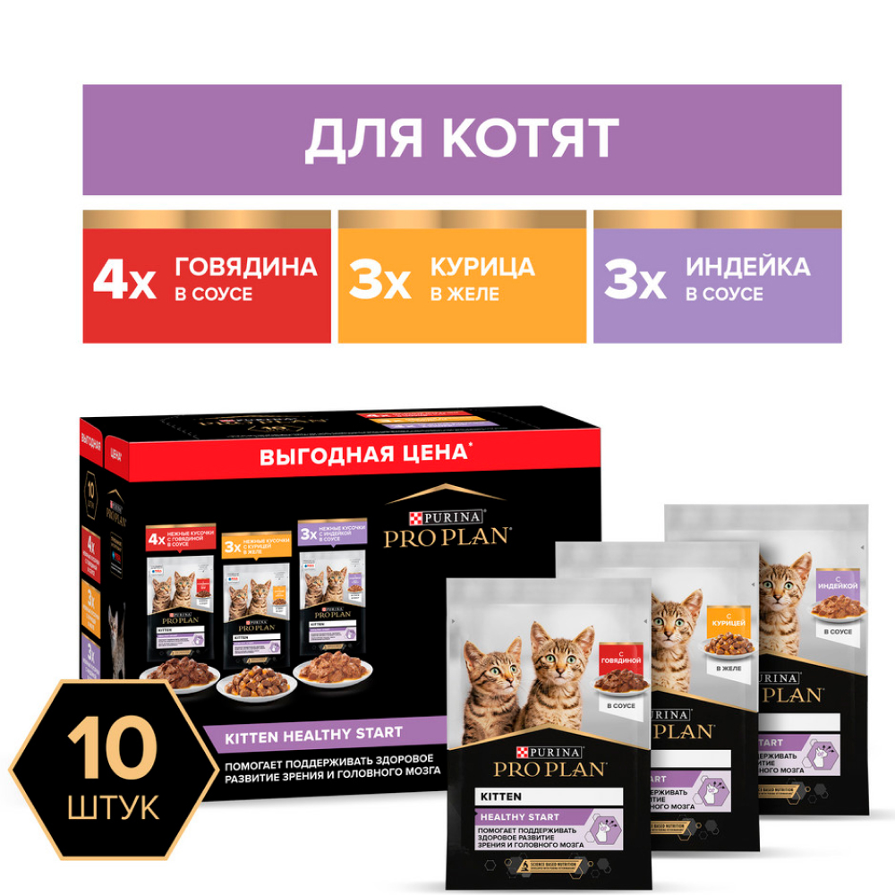 ProPlan Healthy Start Влажный корм (мультипак) для котят, с говядиной в соусе, индейкой в соусе и курицей в желе, 10x85 гр.