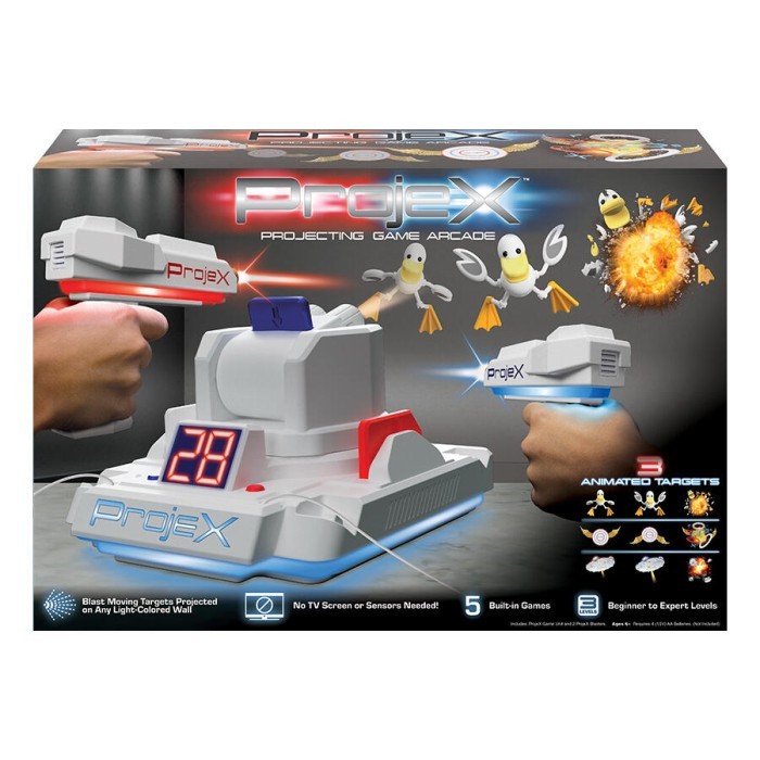 Harap Tanya kan Stock terlebih dahulu ya kak, sebelum Check out!! ProjeX turns any room into an incredible gaming arcade! No need for a TV! Project animated, moving targets onto any blank wall and enjoy real-life gaming, without the limitations of a screen! Blast ANIMATED ducks, targets or UFOs – each with unique sound effects. Play solo, head-to-head, or “Co-Op,”, where players team up to get the highest combined score. With five games and three skill levels, this portable, battery-operated projector goes wherever you go – inside or out. You can even play on a garage door or outside wall of your house. Recommended for ages 6 +. includes 1 ProjeX Game Unit 2 ProjeX Blasters