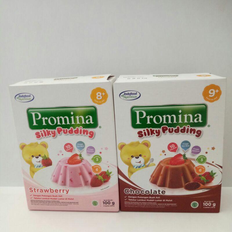 Promina silky pudding usia 8+ dengan varian rasa strawberry dan coklat