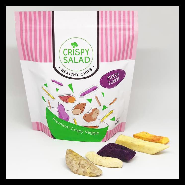 Crispy Salad Mixed Tuber terdiri dari campuran tiga jenis ubi (merah, putih dan ungu) serta talas dan kentang; yang dimana masing-masing mempunyai rasa yang unik dan nutrisi yang berbeda untuk camilan yang lebih enak dan sehat.