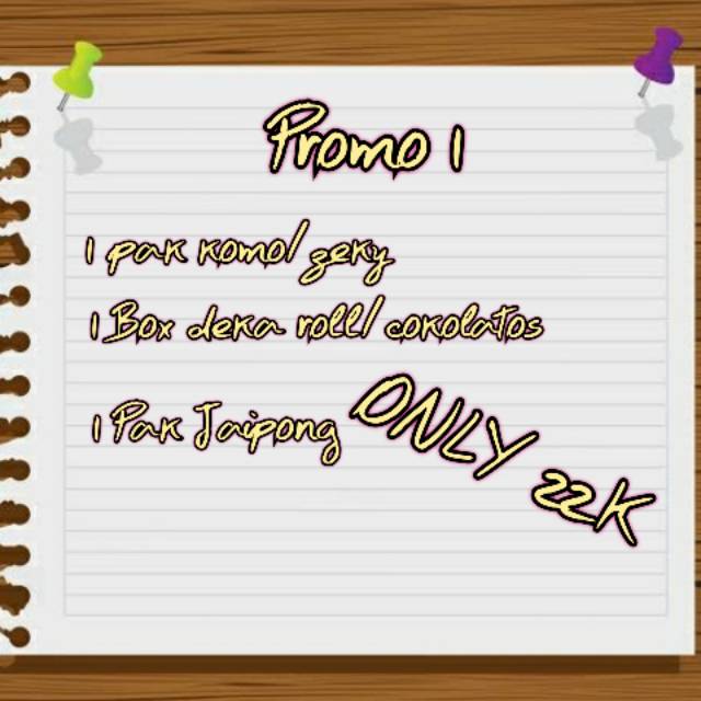 Paket hemat yang isinya 1 pak komo/zeky +deka roll/cokolatos+ 1 pak jaipong
