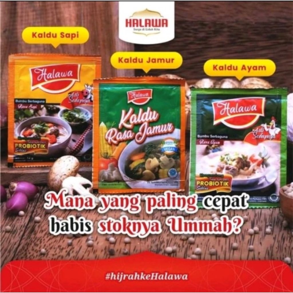 Halawa, bumbu masak organik serbaguna PELOPOR BUMBU MASAK ORGANIK yang diproduksi sesuai standart pabrik modern dan diracik dari bahan dasar organik Halal Thoyyib dari produsen muslim dengan izin produksi Halal MUI.