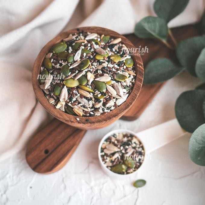 Essential Mix Seeds terdiri dari Organic Chia Seed, Brown Flaxseed, Black Sesame Seed, Pumpkin Seed, Sunflower Seed, White Sesame Seed