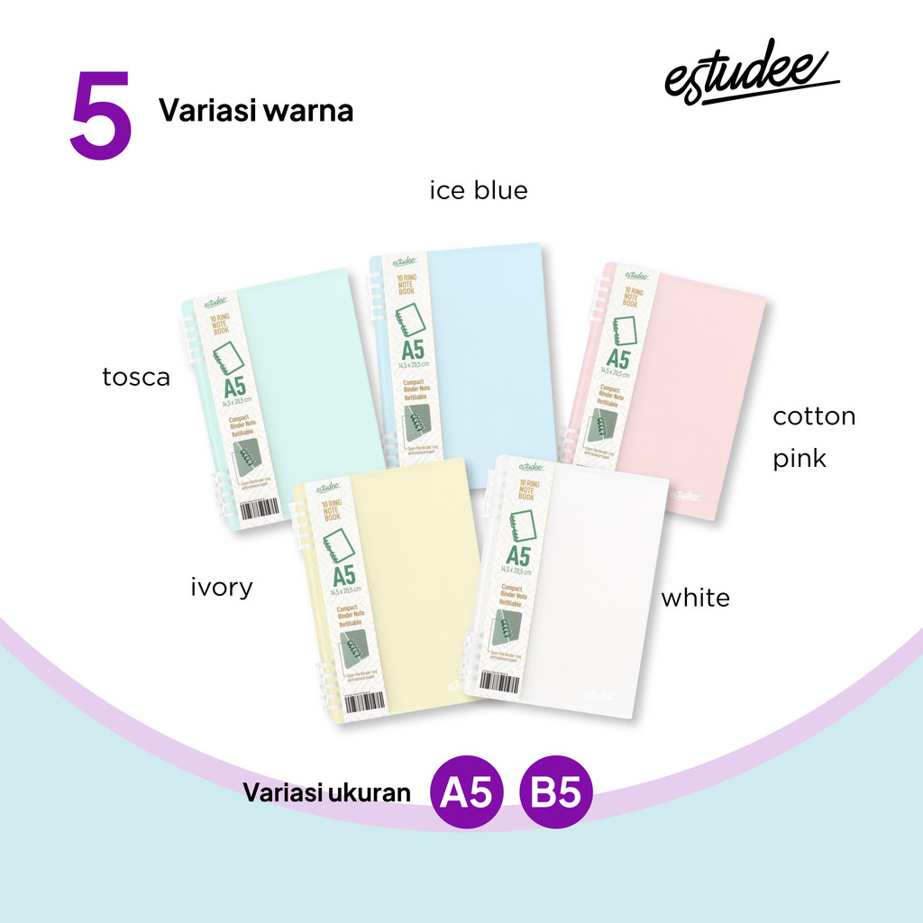 Hi Teman Estudee! ESTUDEE 10RING NOTEBOOK A5 Notebook Ring Ukuran A5 terbuat dari bahan plastik PP yang ramah lingkungan, dilengkapi dengan ring berbahan metal yang kuat, cocok digunakan untuk kertas loose leaf ukuran A5, dan dapat digunakan untuk keperluan sekolah, kantor, serta menulis catatan. #Estudee #StudiYaEstudee