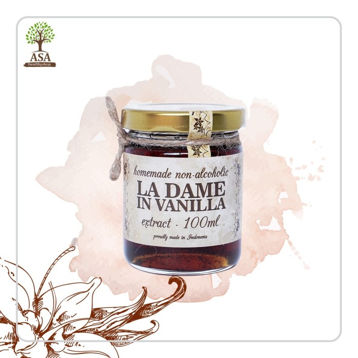 La Dame in Vanilla Extract merupakan ekstrak vanilla non alkohol yang bersertifikasi murni, alami dan bebas gula yang dibuat dari biji vanili organik asli. Vanila asli memiliki lebih dari 250 senyawa rasa dan telah terbukti sebagai anti inflamasi yang kuat dan pendorong kinerja mental.