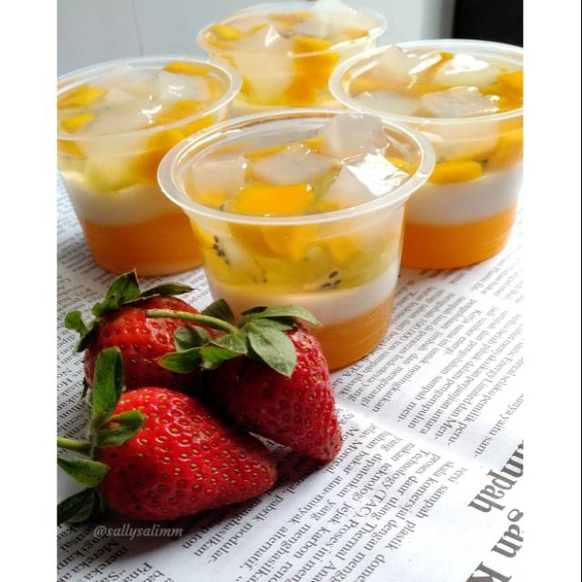 Triple Layered Pudding dengan topping buah - buahan di atasnya sangat rekomen bagi anda yang merupakan pecinta Mangga.