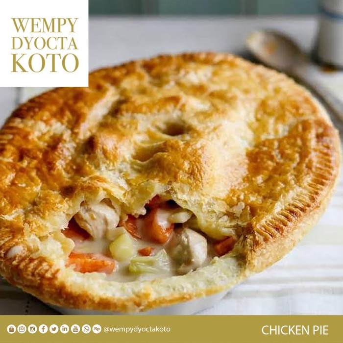 Wempy Dyocta Koto Chicken Pie merupakan modifikasi dari meat pie. Resep meat pie yang asli menggunakan daging cincang, sedangkan chicken pie menggunakan ayam, jamur, saos putih dan sayur lainnya. Chicken pie berupa daging ayam dada yang lalu disiram saus bechamel. Karena ada sebagian orang lebih suka ayam daripada daging, makanya chicken pie selalu disediakan di pub, restoran, bakery dan takeaway shop di Australia.