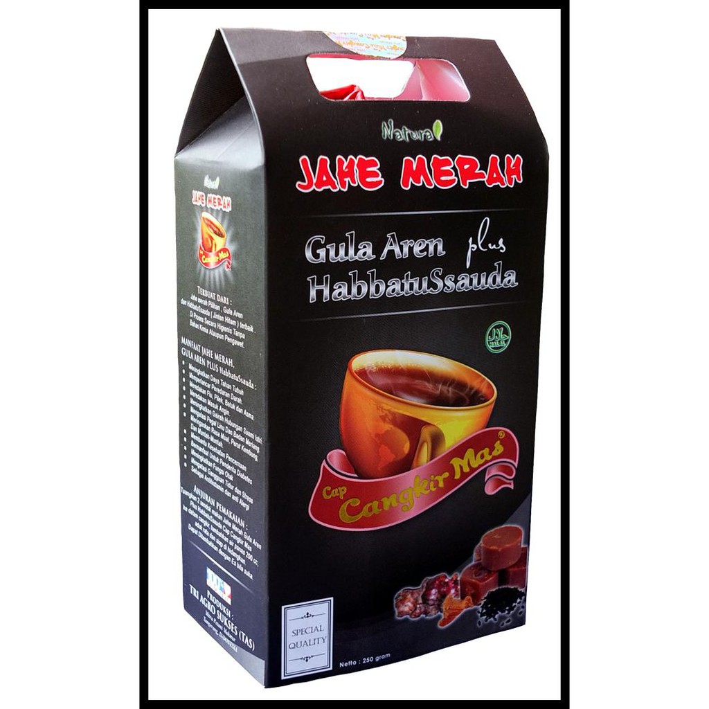 Untuk penikmat jahe merah yang menghindari konsumsi gula pasir, maka produk ini solusinya. Produk ini menggunakan 100% gula aren organik dan ekstrak jahe merah plus habbatusaudah dan pegagan yang sudah dikenal akan khasiatnya untuk kesehatan.