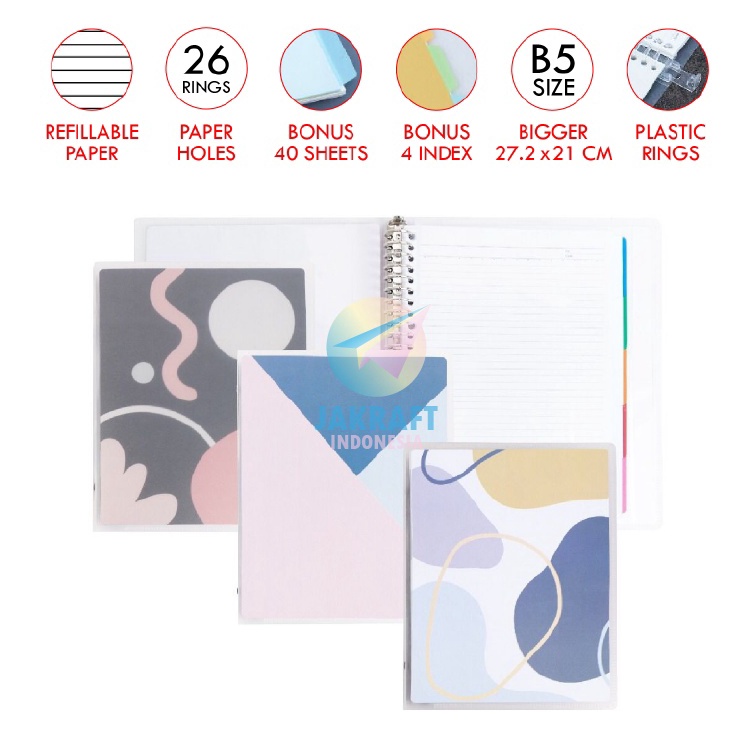 - Keterangan: Binder note untuk loose leaf ukuran B5 dan 26 rings, cocok untuk pelajar, mahasiswa hingga profesional. Sudah termasuk bonus kertas divider 5 index dan kertas loose leaf