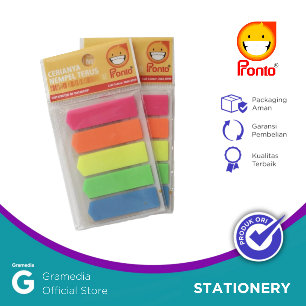 - Keterangan: Sticky Notes merek Pronto bentuk panah berkualitas dengan warna cerah dan lem yang kuat, lebih tahan lama untuk dipakai berulang kali selama masih bersih