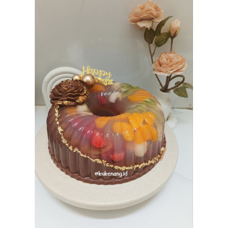 Pudding Choco Fruit pudding rasa coklat dengan taburan buah sudah termasuk fla vanila diameter 22 cm dengan berat +- 3kg
