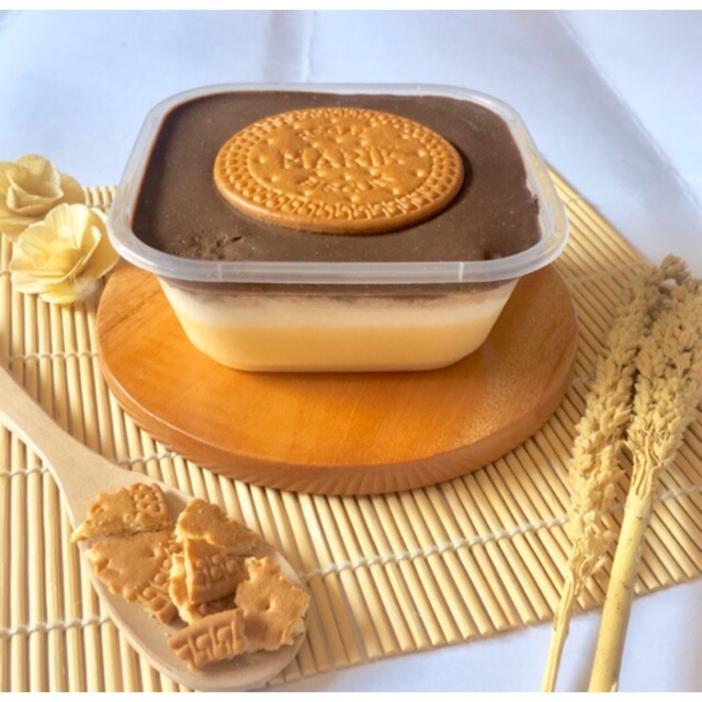 Dengan tambahan di tengah whipping cream di balut coklat yg lembut dan tambahan topping di atas nya dengan Marie
