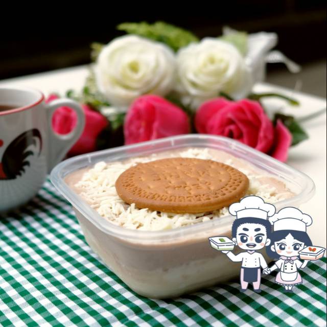 Pudding vanila dengan fla coklat yang nikmat,ditambah taburan keju dan biskuit regal