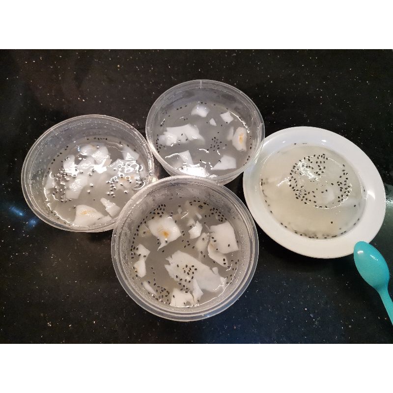 Pudding terbuat dari air kelapa hijau dengan irisan daging kelapa dan chia seeds yang baik untuk kesehatan pencernaan, anti aging dan menurunkan tekanan darah dan kolesterol
