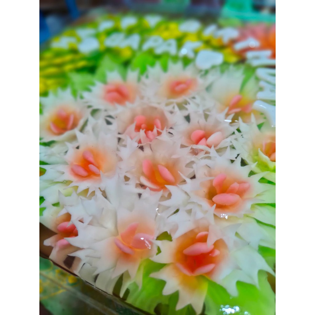Untuk Pudding art mi’Eka berupa sajian puding bening / seperti kaca yang dilukis didalamnya dengan lukisan menarik menggunakan tools art khusus. Komposisi susu, agar, dan nutrijell sebagai bahan untuk membuat lukisan tersebut. Khusus berbentuk bunga Krisan