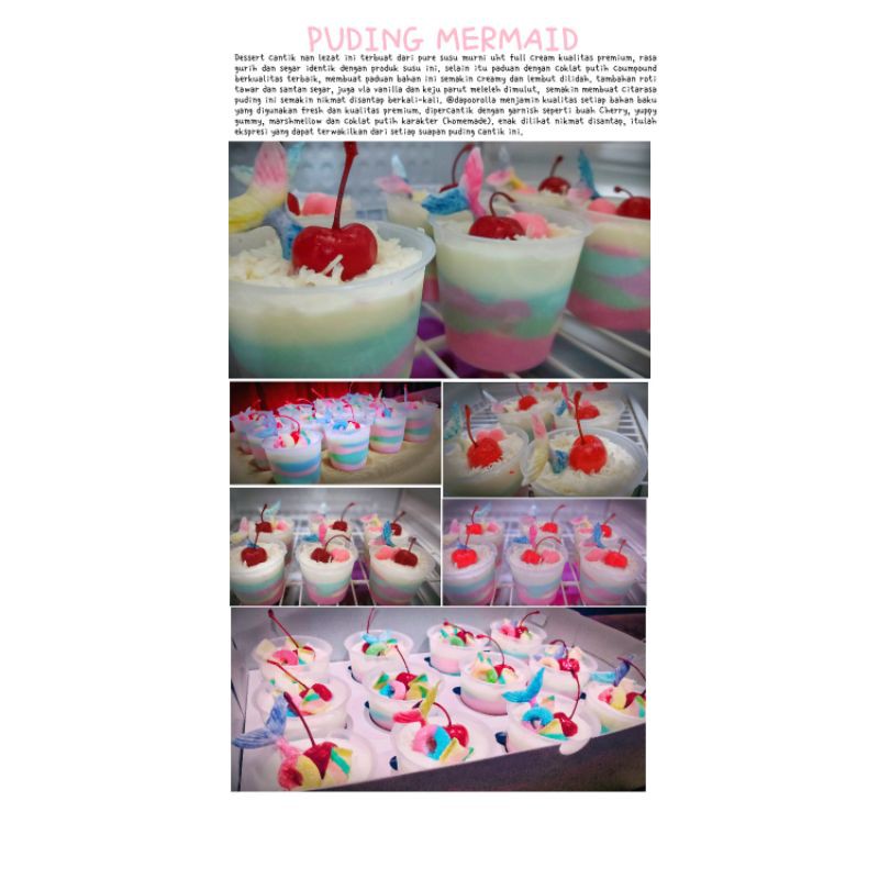Puding cantik ini terbuat dari susu murni uht full cream kualitas premium, rasa yang dihasilkan sangat creamy dan gurih.. ditambah lagi dengan coklat putih coumpound dengan kualitas terbaik, tambahan lain roti tawar dan santan segar menambah citarasa puding ini sangat nikmat untuk disantap. apalagi jika dalam keadaan dingin... saus vla vanilla dan keju parut meleleh dimulut.. selain itu, puding ini dihias dengan garnish marshmellow, buah Cherry, yuppy gummy dan coklat putih karakter aestetik(homemade).
