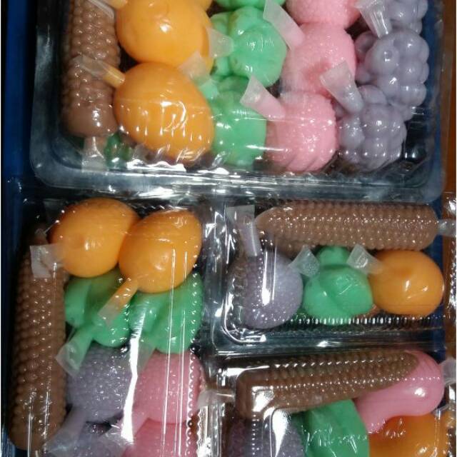 tersedia berbagai bentuk buah-buahan jagung dan ikan