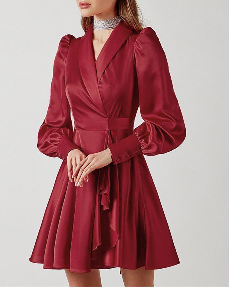 Puff Lantern Sleeve Tied Detail Ruffles Ruched Dress, Red